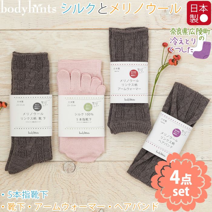 【送料無料!日本製 シルク100%5本指とメリノウール靴下&アームウォーマー&ヘアバンドの4点セット 】