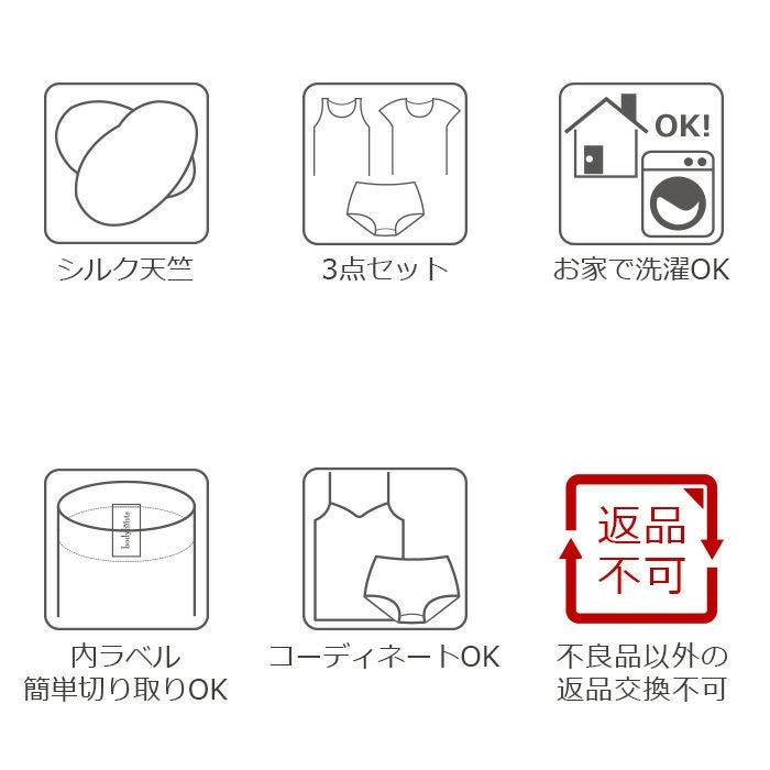 他の画像を見る シルク100%天竺 インナー3点セット(タンクトップ・フレンチ袖・ショーツ)送料無料 単品販売価格+送料 ¥ 11,470 のところ 販売価格 ¥ 10,120 税込 カートに入れる お気に入りに登録する 送料無料 シルク お得セット
