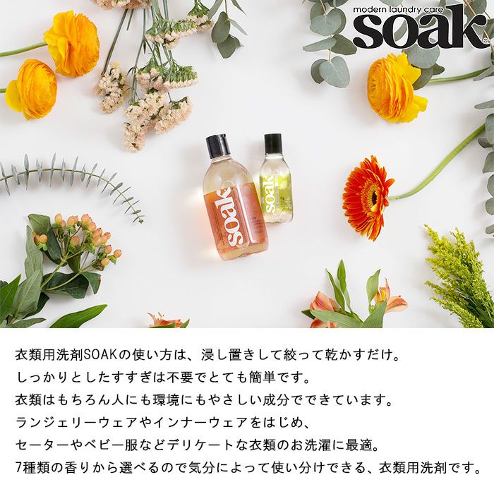 他の画像を見る すすぎ不要のデリケート衣類用洗剤 SOAK 衣服用洗剤 フルサイズ 375ml ギフト人気 販売価格 ¥ 2,970 税込 人や環境にもやさしい衣類用洗剤【N390】 カートに入れる お気に入りに登録する